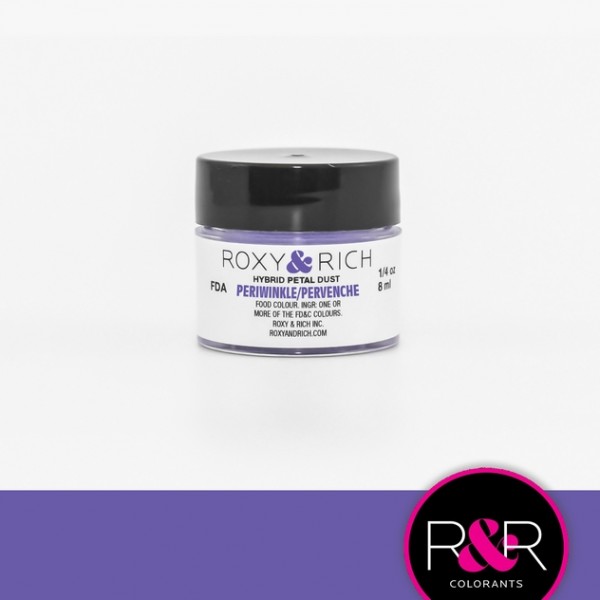 Poudre matte ( petal dust ) de couleur pervenche ( bleu violet ). S'utilise à sec sur le chocolat, le glaçage royal, le fondant à rouler ou le pastillage ou bien diluée avec de l'acool ou jus de citron pour un effet différent. S'utilise également avec le gel décoratif, le sucre d'orge et l'isomalt.