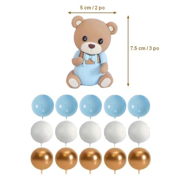 Ensemble de décoration pour gâteau avec un petit ourson garçon ainsi que 15 ballons sur tige de couleur bleu pâle, blanc et or parfait pour souligner la venue de bébé ou pour souligner un anniversaire. Après dégustation vous pourrez garder ce joli petit ensemble comme souvenir / bibelot. L'ensemble comprend au total 17 pièces.