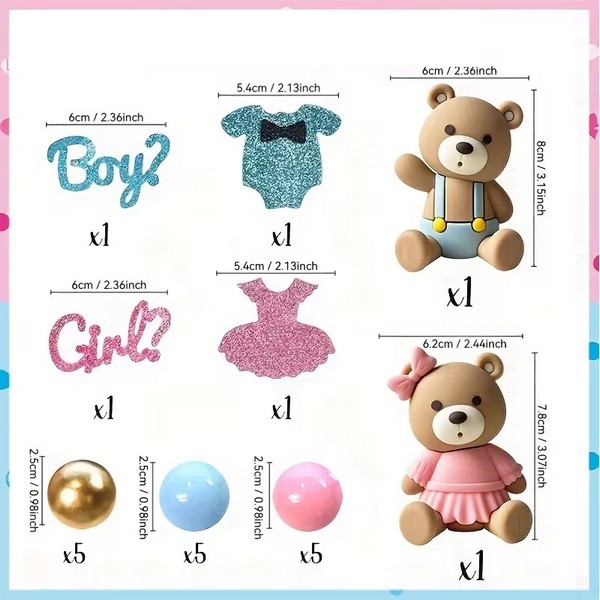 Ensemble de décoration pour gâteau pour la fameuse question Fille ou Garçon ? avec un petit ourson fille et un petit ourson garçon ainsi que 15 ballons sur tige de couleur rose, bleu et or ainsi que pick Girl ? et Boy ? et robe et pyjama noeud papillon parfait pour souligner la venue de bébé. L'ensemble comprend au total 21 pièces.
