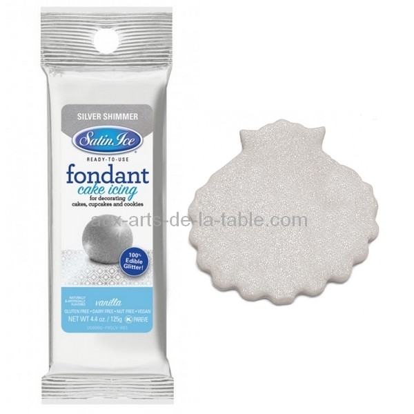 Fondant à rouler Satin Ice Argent lustré de qualité supérieure, non-collant et pliable. Il donne un fini satiné avec de tout petits brillants qui donnera de l'élégance à tout gâteau. C'est le produit idéal pour couvrir les gâteaux et réaliser de jolies décorations.
